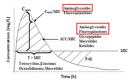 - Phụ thuộc vào nồng độ: Aminoglycoside là loại kháng sinh phụ thuộc vào nồng độ (Cpeak/MIC) và AUC/MIC. Điều này có nghĩa là việc tăng nồng độ sẽ gia tăng hiệu suất diệt khuẩn.