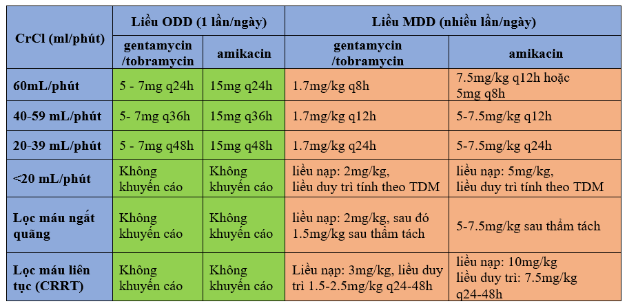 Liều gợi ý kháng sinh aminoglycoside theo chức năng thận